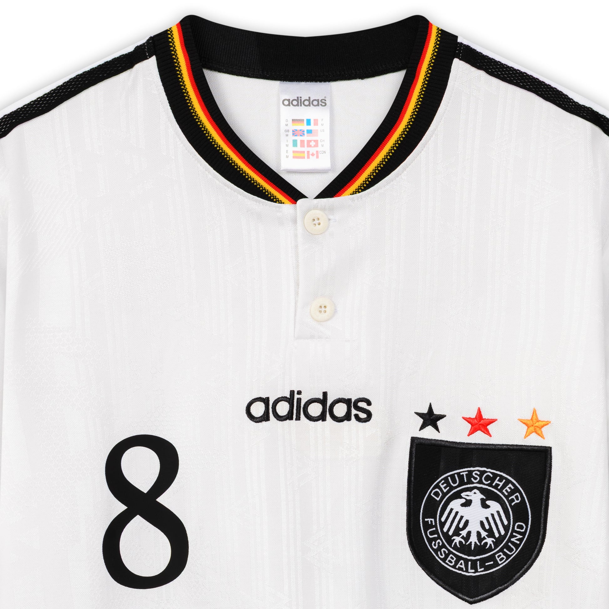 Sehr schönes und aufwendig gearbeitetes Retro-Vintage-Heimtrikot der deutschen Nationalmannschaft zur EM 1996 mit der Spielernummer 8 – Mehmet Scholl